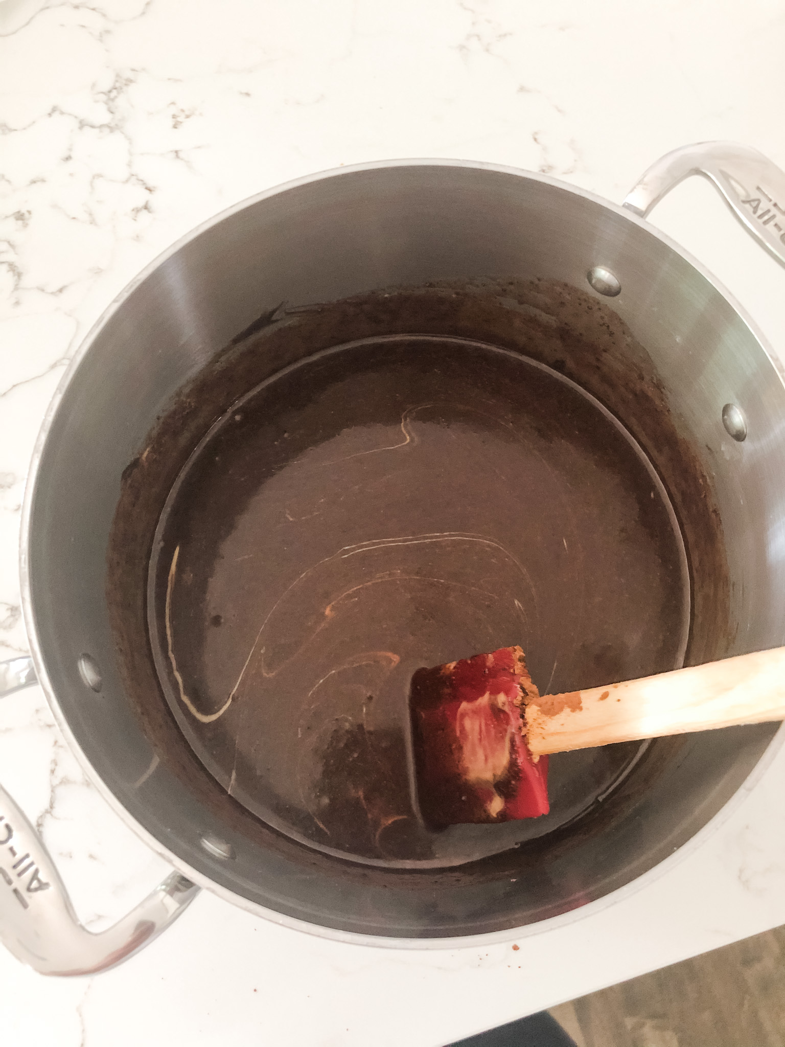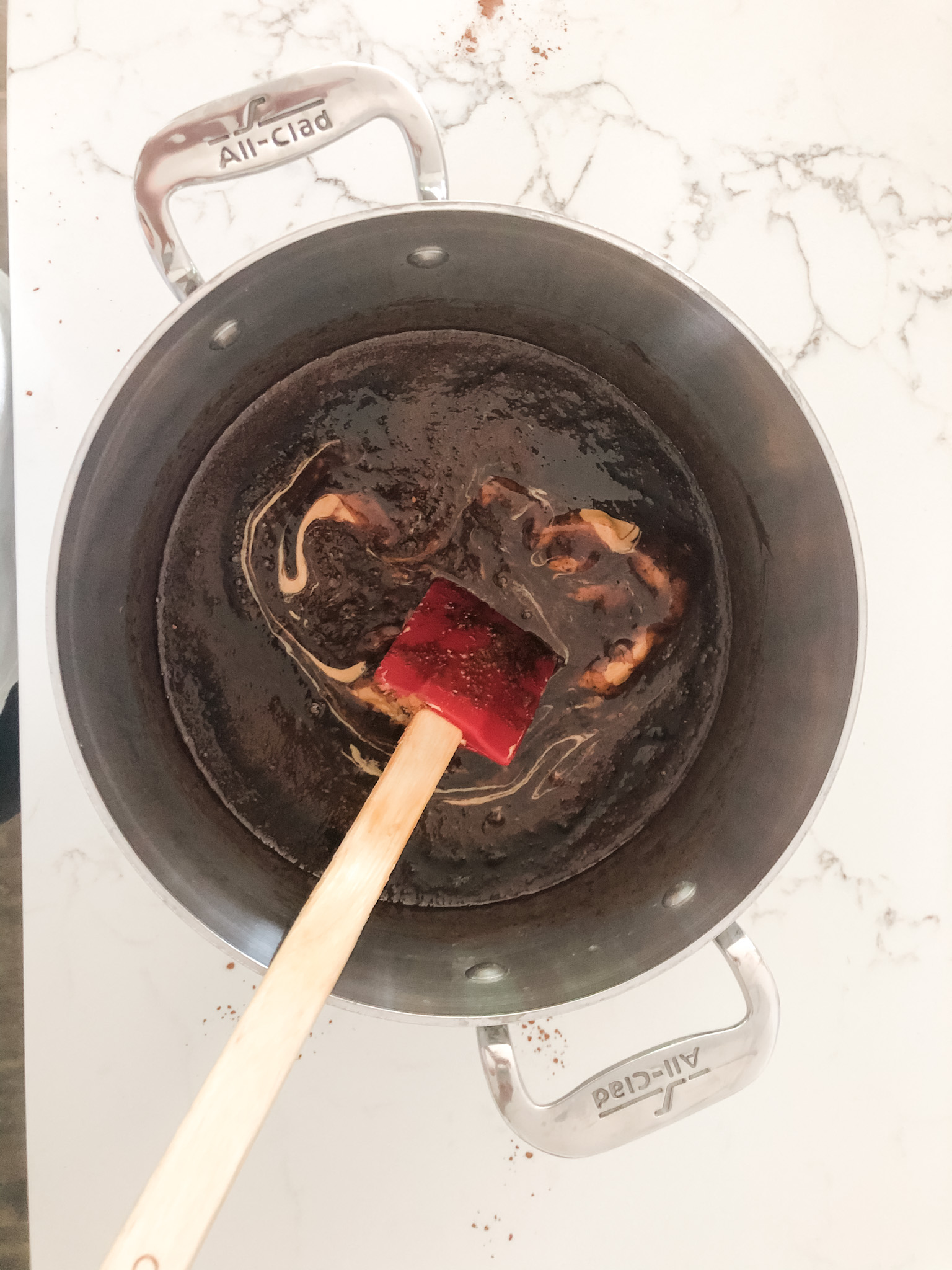 Melt together the butter, milk, cocoa and sugar over medium heat. You’ll want to heat it slowly to keep the butter from browning/burning and the milk from curdling. If you’re using unsalted butter, throw a pinch of salt in, too.