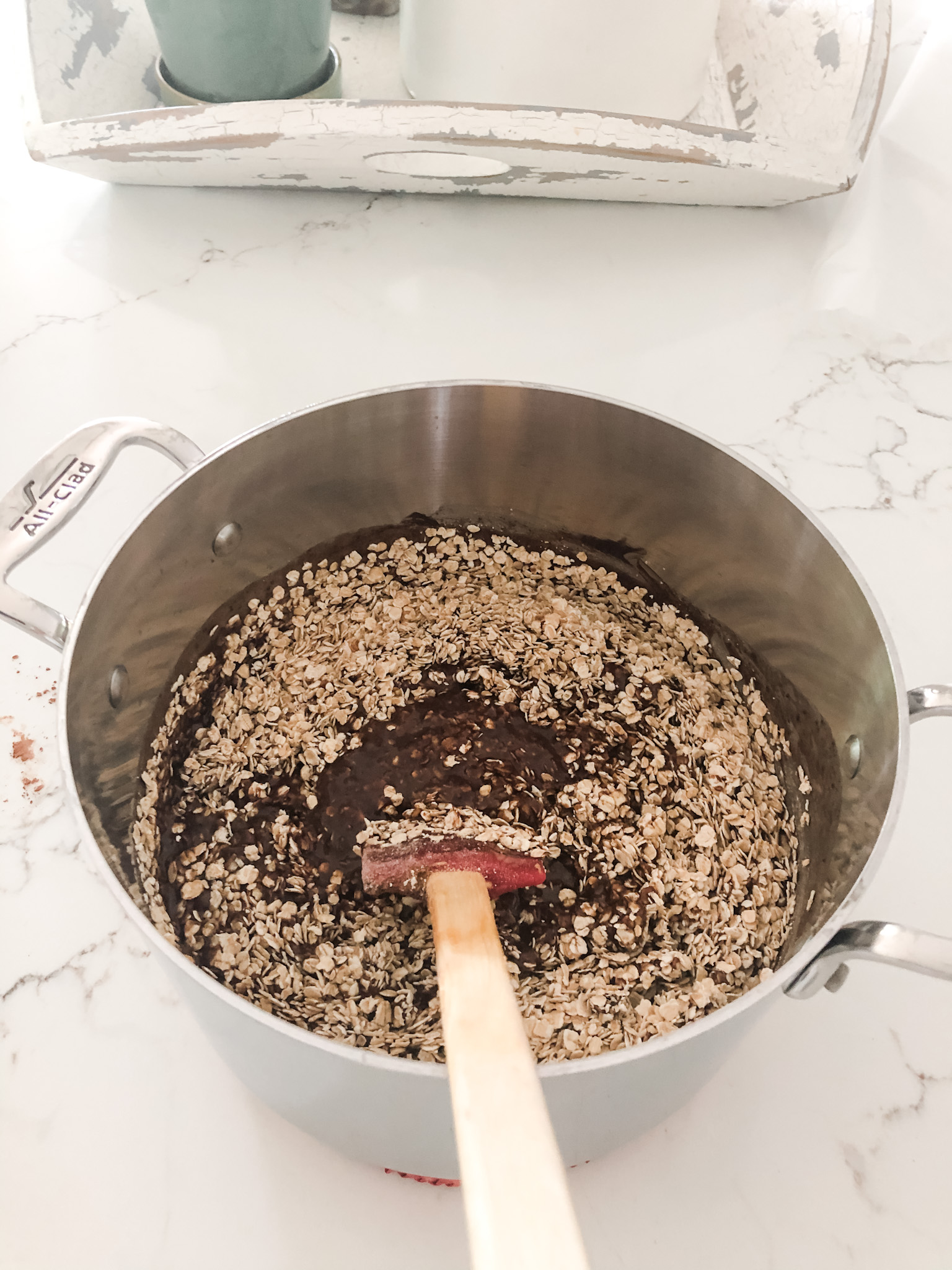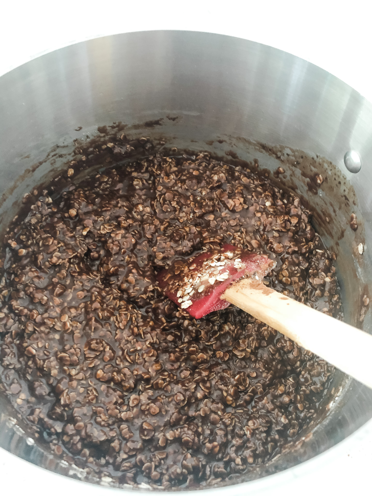 Finally, pour in the oatmeal and stir like there’s no tomorrow, until all the oats are covered in chocolate. Quick is key here, before your mixture starts to firm up.